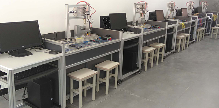 單片機控制功能實訓考核裝置采用烤漆鋼板制作的臺式結(jié)構(gòu)。實訓臺的抽屜柜用于存放實訓模塊,抽屜柜與臺面之間布置實訓模塊安裝支架,最上一層是工作臺臺面。用于技能競賽時在臺面上放置設備安裝底板,在底板上安裝試題擬定的單片機控制裝置需要的模塊,連接控制電路,編寫的控制程序輸入單片機后,按下運行指令開關,單片機控制裝置就按程序運行。