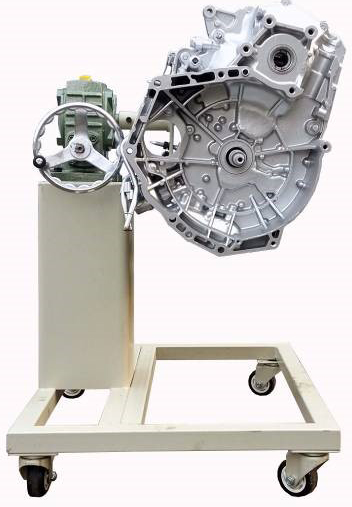 采用減速翻轉(zhuǎn)機(jī)構(gòu),可使變速器旋轉(zhuǎn)任意角度,并能任意位置鎖止,便于學(xué)生從不同的角度進(jìn)行拆卸和裝配。