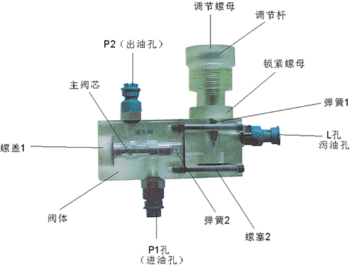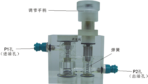 2、溢流閥結(jié)構(gòu)上參考了國產(chǎn)P-63B型低壓直動(dòng)式溢流閥,其閥體閥蓋、鎖緊螺母、調(diào)節(jié)螺母、螺塞等采用了進(jìn)口透明有機(jī)玻璃材料精制而成,閥芯、調(diào)節(jié)桿采用了45#中碳鋼材料。并配合彈簧,油接頭,密封圈等標(biāo)準(zhǔn)件裝配而成,通過它可明確地觀察到閥芯、彈簧、油孔等結(jié)構(gòu)及其運(yùn)行過程,具有形象逼真,性能可靠等優(yōu)點(diǎn)。它即可作為教學(xué)模型,也可以作為液壓實(shí)驗(yàn)元件進(jìn)行實(shí)驗(yàn)演示。