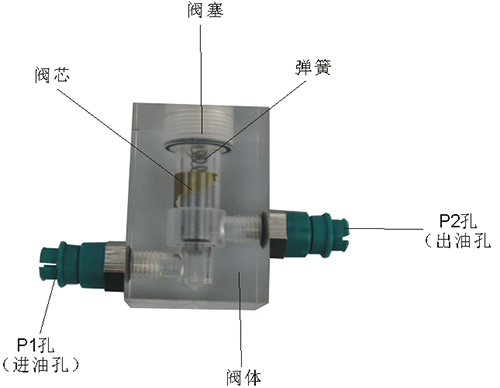 2、單向閥結(jié)構(gòu)上參考了國產(chǎn)I--63B型板式單向閥,其閥體,螺塞等采用了進(jìn)口透明有機(jī)玻璃材料精制而成,閥芯采用了45#中碳鋼材料,并配合彈簧,油接頭,密封圈等標(biāo)準(zhǔn)件裝配而成,通過它可明確地觀察到活塞、彈簧、油孔等結(jié)構(gòu)及其運(yùn)行過程,具有形象逼真,性能可靠等優(yōu)點(diǎn)。它即可作為教學(xué)模型,也可以作為液壓實(shí)驗(yàn)元件進(jìn)行實(shí)驗(yàn)演示。