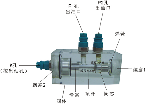 2、液控單向閥結(jié)構(gòu)上參考了國產(chǎn)IY-25B型液壓單向閥,其閥體、螺塞等采用了進(jìn)口透明有機(jī)玻璃材料精制而成,閥芯、頂桿采用了45#中碳鋼材料,并配合彈簧,油接頭,密封圈等標(biāo)準(zhǔn)件裝配而成,通過它可明確地觀察到活塞、彈簧、油孔等結(jié)構(gòu)及其運(yùn)行過程,具有形象逼真,性能可靠等優(yōu)點(diǎn)。它即可作為教學(xué)模型,也可以作為液壓實(shí)驗(yàn)元件進(jìn)行實(shí)驗(yàn)演示。